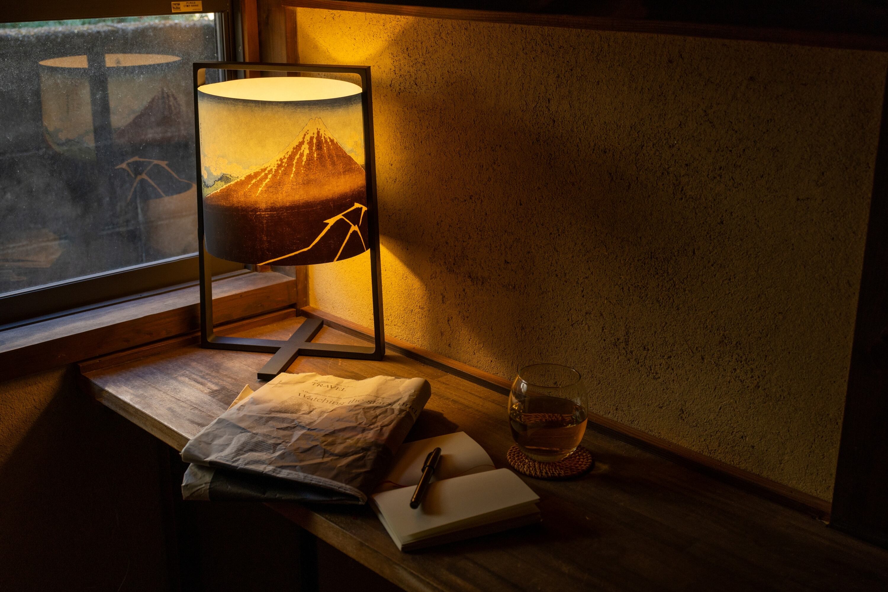 その灯りは和紙を通して柔らかく拡散し、北斎の名作を光とともに映し出します。